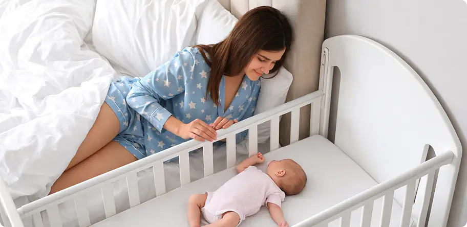 Чтобы между взрослой кроватью и детской кроваткой не было зазора, в котором может застрять ребёнок. Необходимо надёжно зафиксировать кроватку, чтобы она не отъехала. Приставная кроватка — это золотой стандарт безопасности, рекомендованный национальными педиатрическими сообществами.