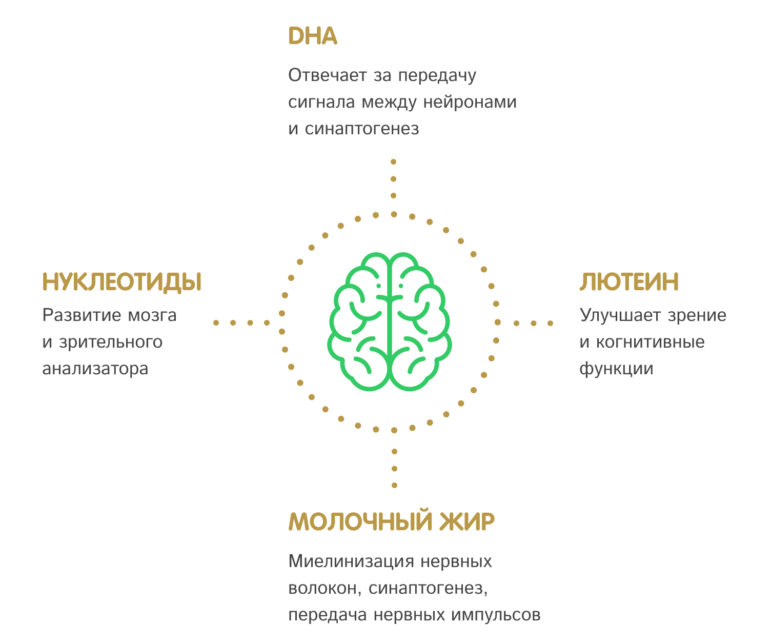О нейронутриентах известно довольно давно, но с каждым годом появляются все новые данные, расширяющие наше предстваление о влиянии компонентов пищи на развитие мозга. Примечательно, что некоторые из нутриентов играют важную роль на ранних этапах развития ЦНС, а то время как другие могут иметь значение во взрослом, или даже старческом возрасте. Так, для детей первого года жизни важнейшее значение имеют такие нейронутриенты, как DHA, лютеин, нуклеотиды, а также ганглиозиды, сфинголипиды и холестерин, входящие в состав молочного жира. Дефицит этих нутриентов может привести к нарушениям развития ЦНС.