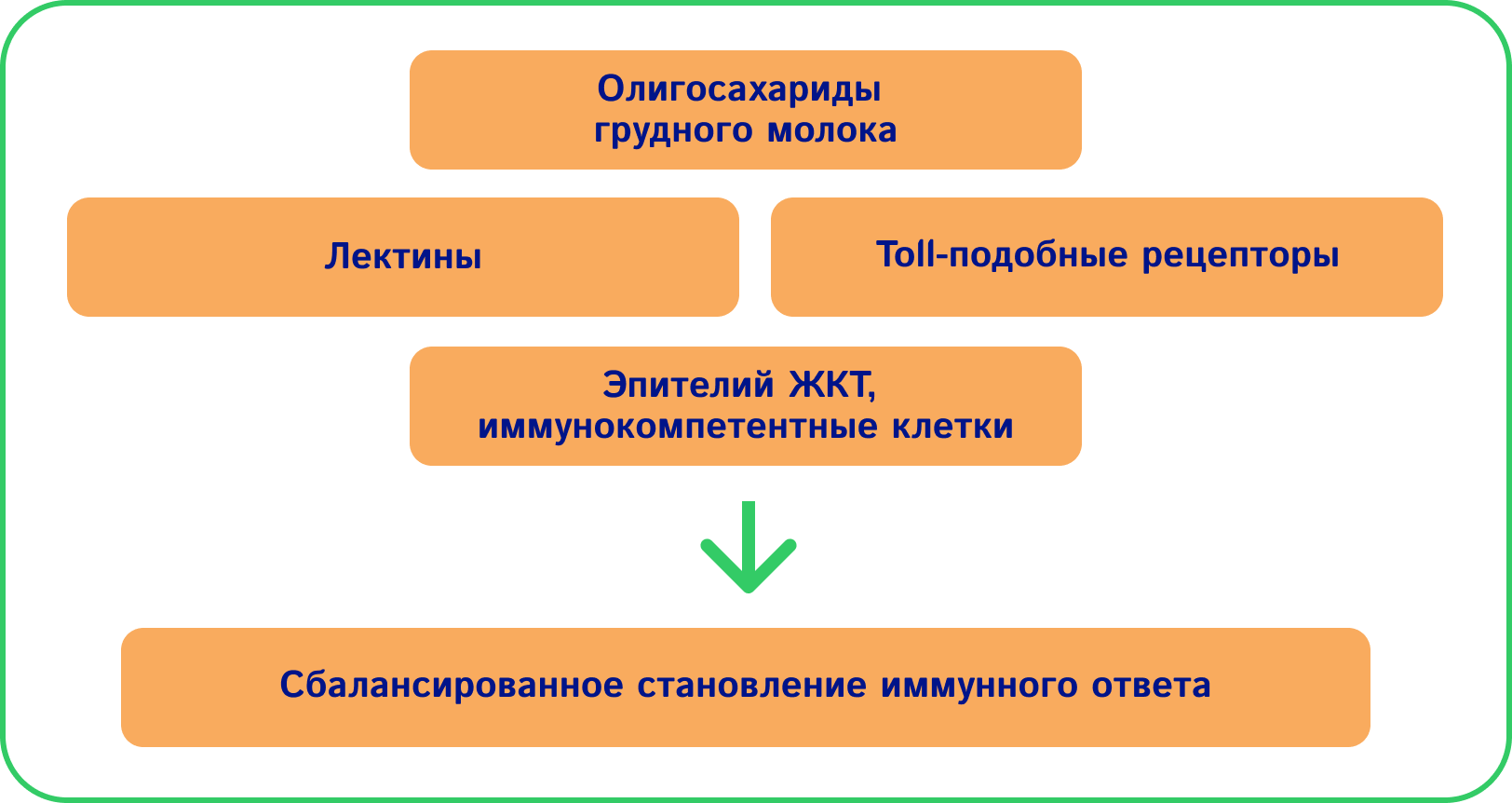 ОГМ способны связываться с лектинами и toll-подобными рецепторами, которые есть на эпителии желудочно-кишечного тракта и на иммунокомпетентных клетках, и обеспечивать сбалансированное становление иммунного ответа у ребенка.